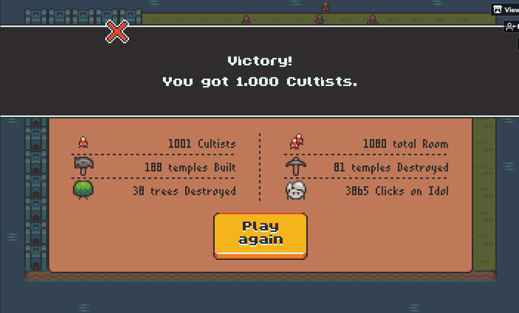 Idle? "Intense" is the word you're looking for. But jokes aside, it was pretty fun. Won on my 3rd try. It starts off kinda slow but it seems to get more and more intense. Could use a pause button. And it got me thinking there could be additional playmodes. One that is purely idle just for relaxation. So none of that "every cultists dies quickly". They'd just have to wait. One that is more on the strategy side. So the cultists don't die. But also, e.g. the area could be more limited and you couldn't just break down the buildings.